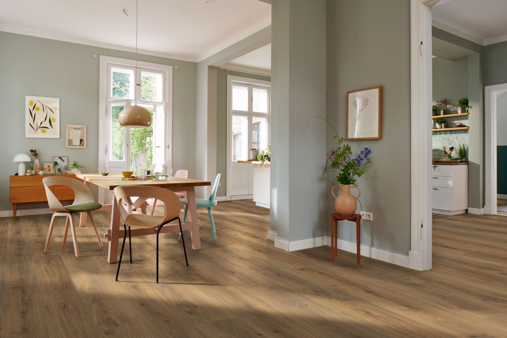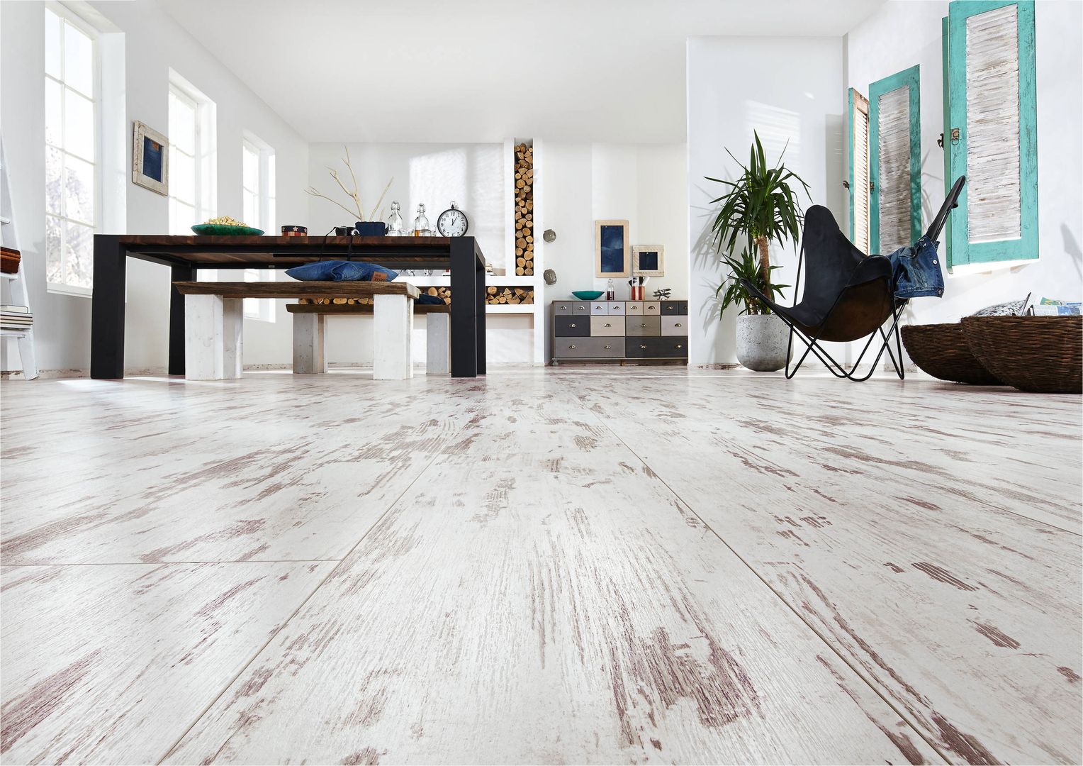 Was für den Laminatboden spricht: Zunächst einmal ist er sehr robust und besonders strapazierfähig. Diese Eigenschaften verdankt er den unter hohem Druck und ebensolchen Temperaturen gepressten Schichten. Die Deckschicht garantiert außerdem eine hohe Abriebfestigkeit. Laminat ist ein reiner Dekorboden, daher ist durch den digitalen Druck auf der Deckschicht praktisch alles an Design und Gestaltung möglich. Favorit ist aber immer noch die gute alte Holzoptik, die dem Parkett meist zum Verwechseln ähnlich sieht. Außerdem sind Laminate perfekt für Fußbodenheizungen geeignet – und meist sogar nebelfeucht wischbar, also äußerst pflegeleicht.